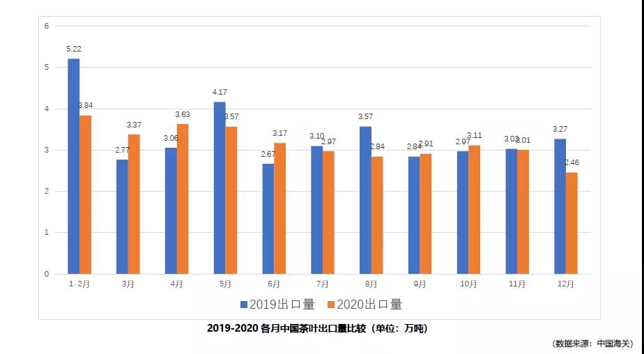 2020年1-12月,中國茶葉出口量總計為34.88萬(wàn)噸,比2019年全年減少1.77萬(wàn)噸,同比減少4.84%;這是自2014年以來(lái),中國茶葉出口量首次出現下降。